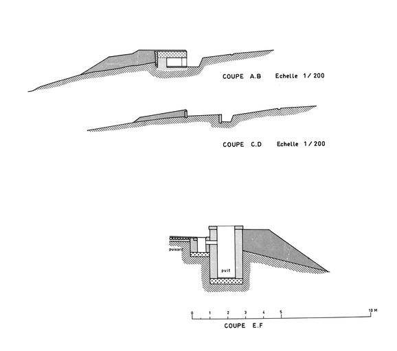 Coupes (A-B : traverse, C-D : parapet, E-F : puits) de la batterie de côte du Petit Gouin (4 canons de 95 mm)Immatriculation