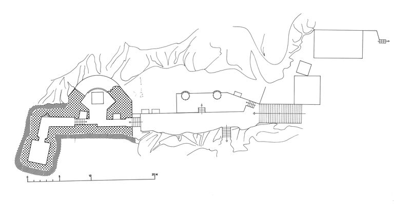 Plan de la batterie du Petit Gouin : bunker - casemate nord coiffant le débouché du magasin à poudre sous roc, batterie de côte (canons de 95 mm) et abris en béton arméImmatriculation