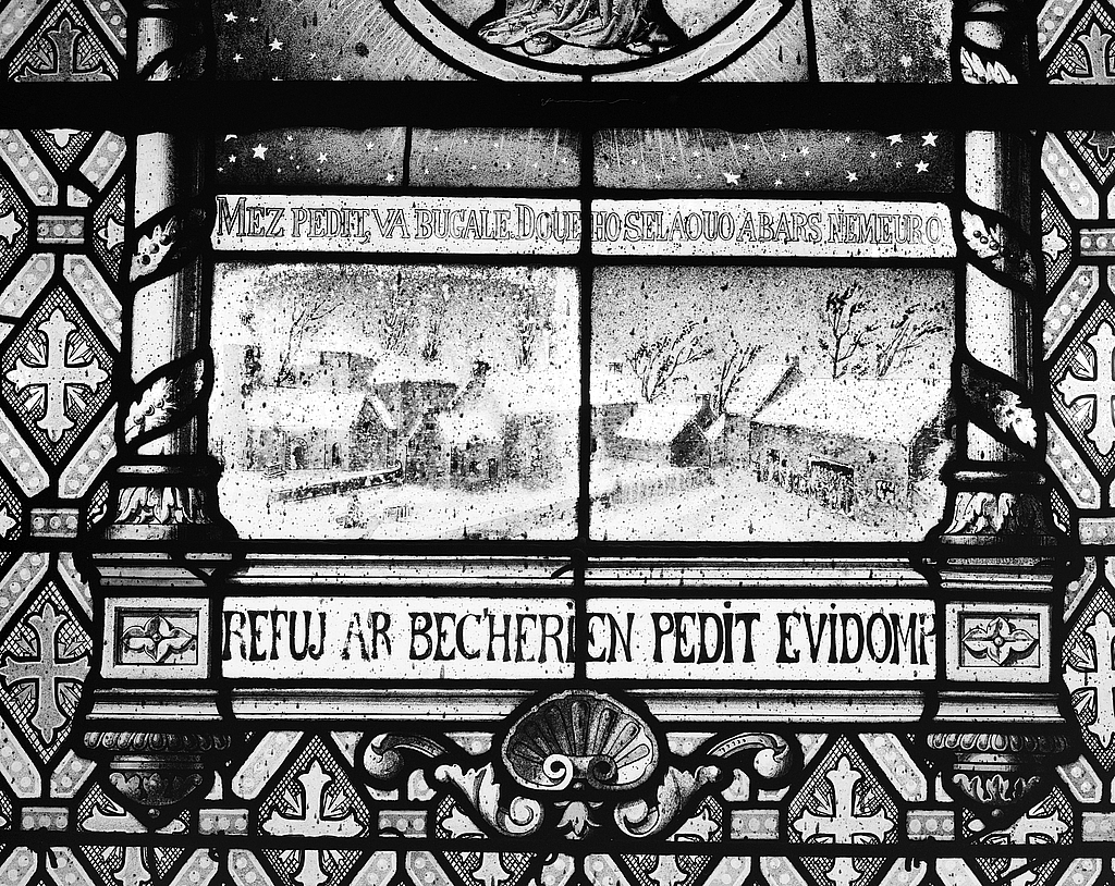Verrière 5, village de Pontmain sous la neige, détail.Immatriculation