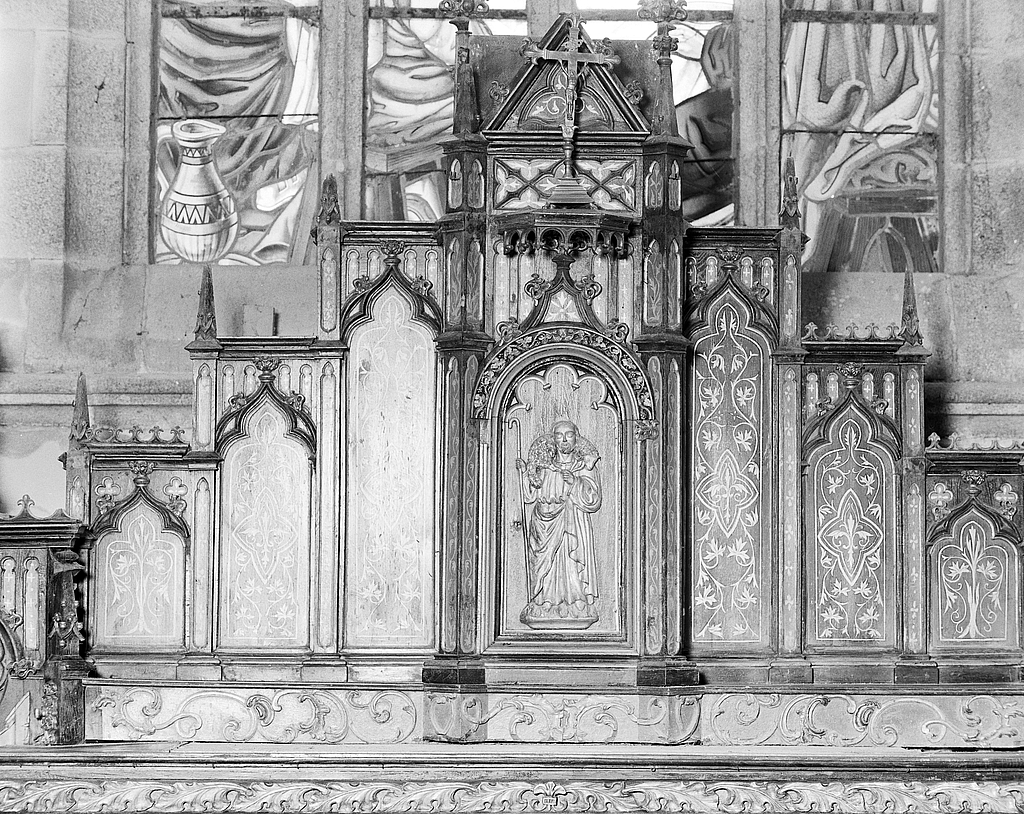 Autel, retable, tabernacle, gradin d'autel (maître-autel, autel tombeau, tabernacle à ailes), style néo-gothique, église paroissiale Saint-Eloi (Mespaul),