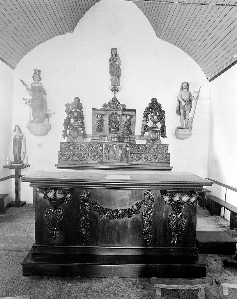 Autel, retable, tabernacle, gradins d'autel (2) (maître-autel, autel à la romaine, retable, tombeau de la famille), chapelle Sainte-Catherine (Mespaul),