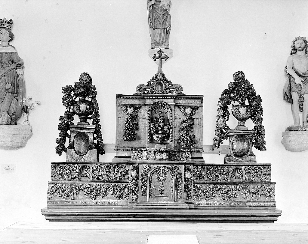 Autel, retable, tabernacle, gradins d'autel (2) (maître-autel, autel à la romaine, retable, tombeau de la famille), chapelle Sainte-Catherine (Mespaul),