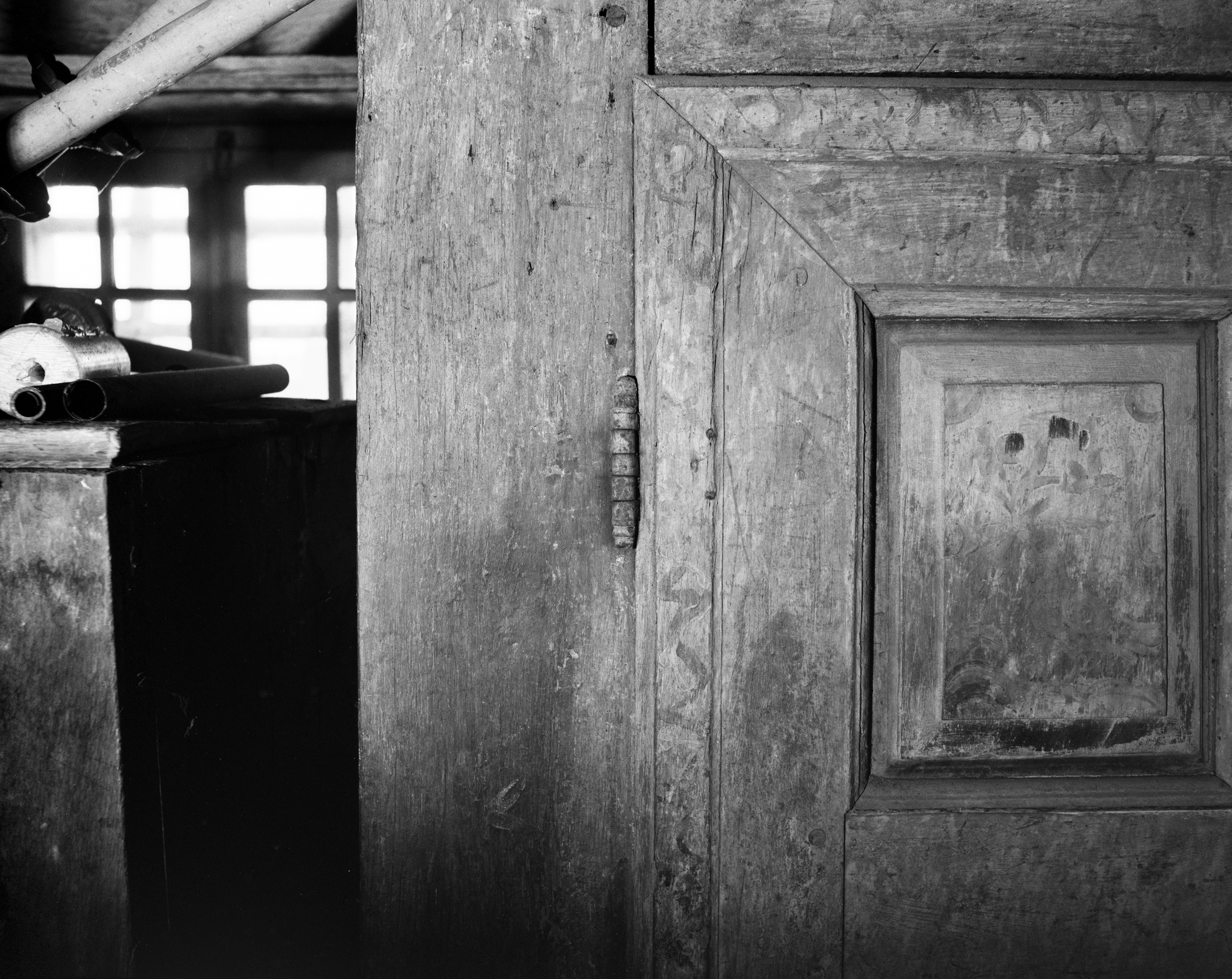 Armoire de sacristie, battant gauche : détail d'un gond et des assemblages (état en 1987)Immatriculation
