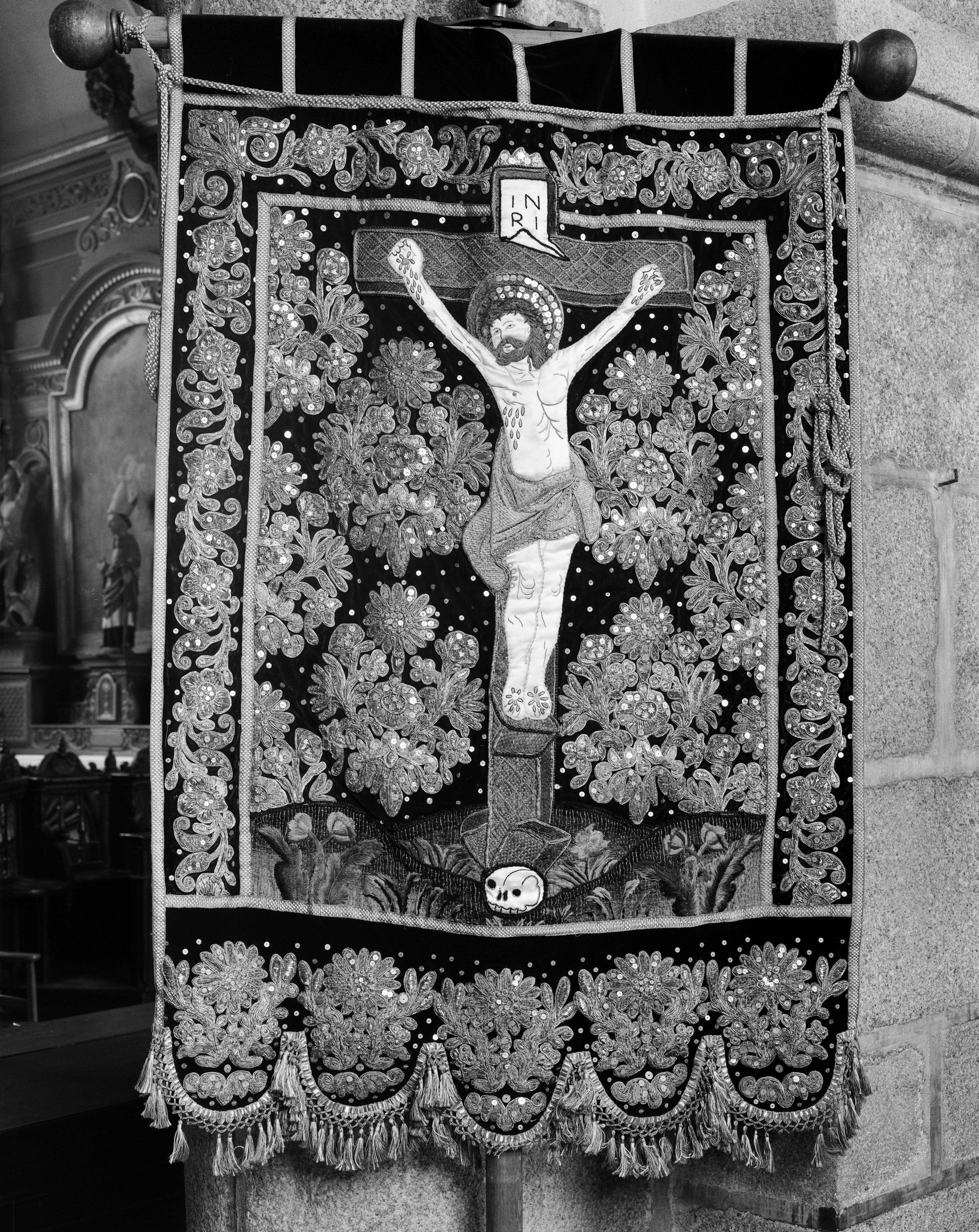 Bannière de procession de confrérie : Don du Rosaire, Christ en croix, église paroissiale Sainte-Édiltrude (Tréflez),