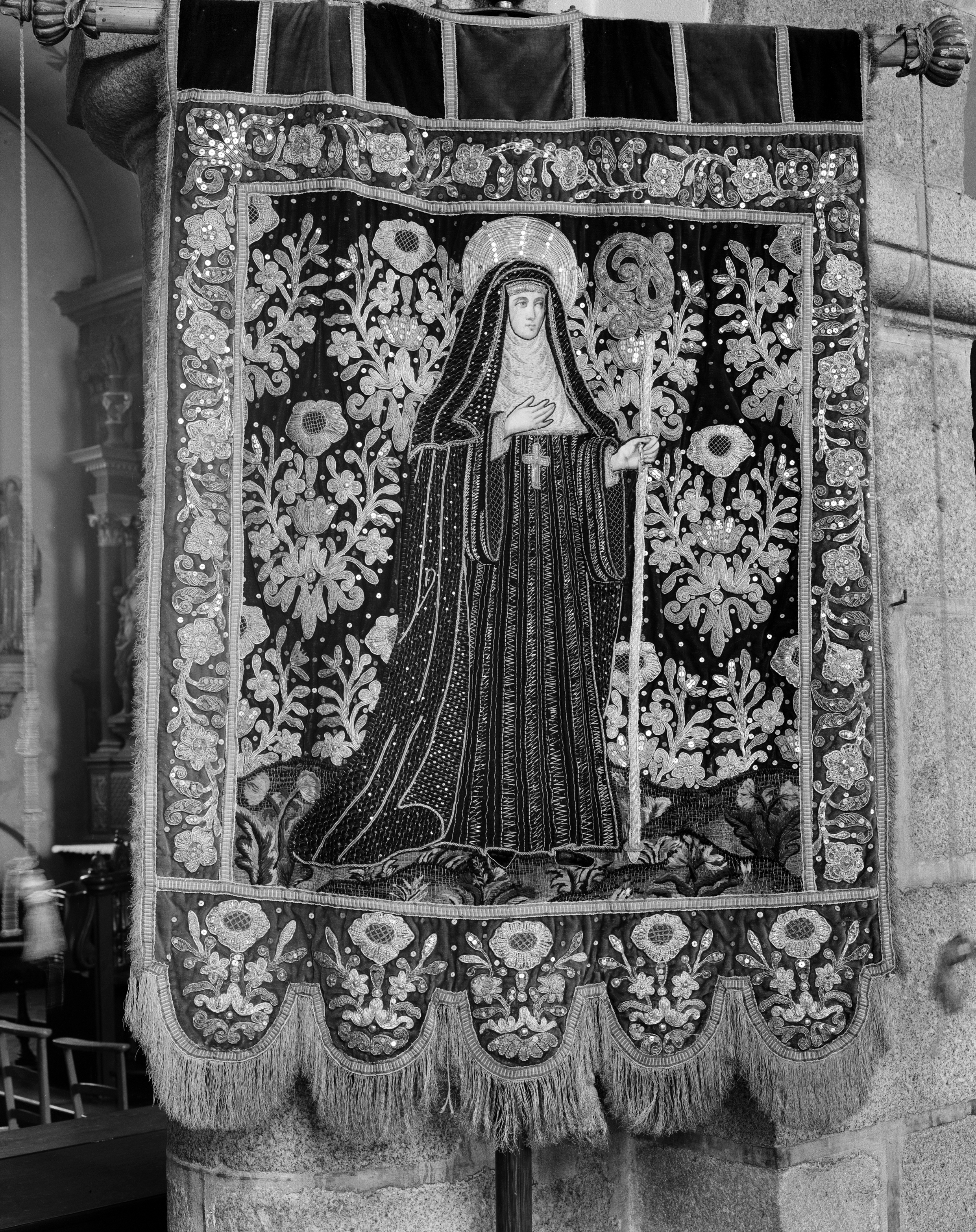 Bannière de procession paroissiale : Sainte Étheldrède, Calvaire, église paroissiale Sainte-Édiltrude (Tréflez),