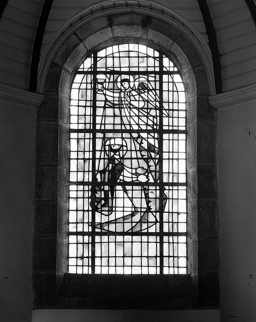Verrière 9 : vies du christ et de la vierge, verrière historiée, église paroissiale Saint-Colomban (Plougoulm),