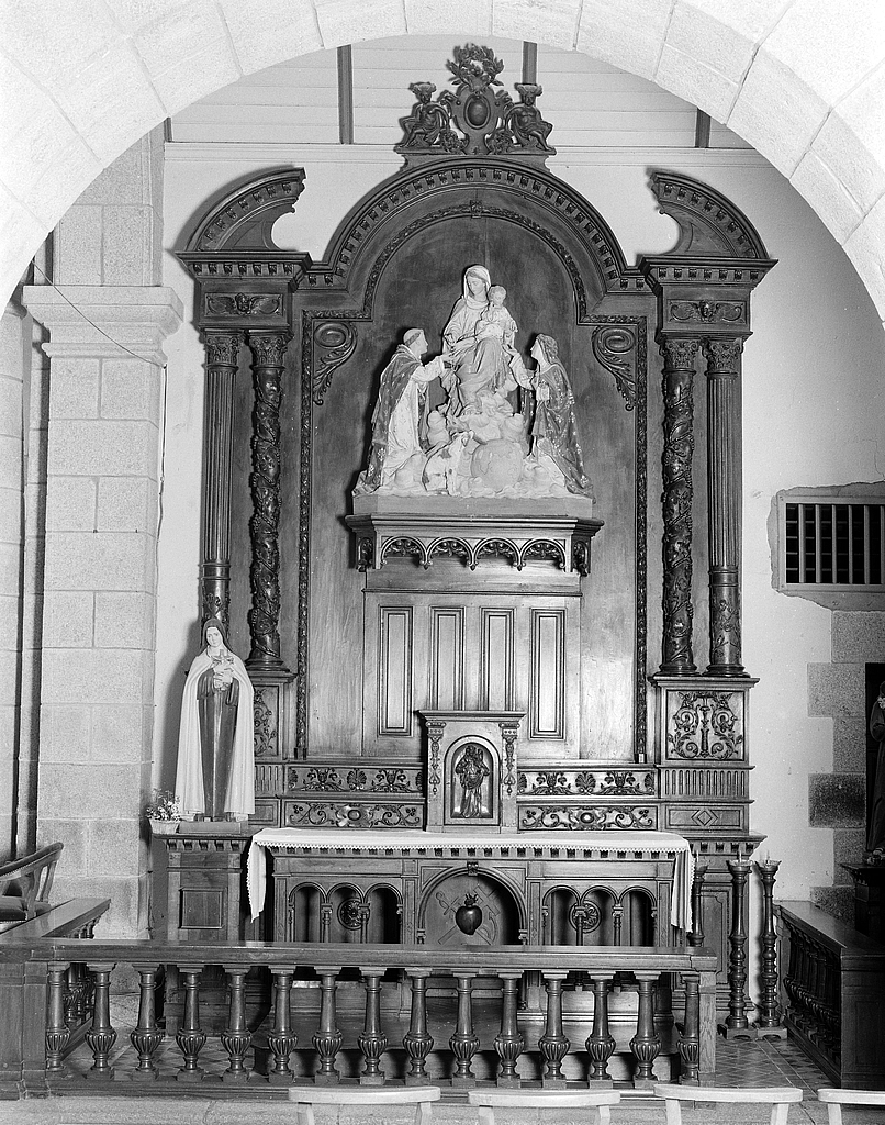 Autel, retable, tabernacle, gradins d'autel (2) (autel secondaire, autel tombeau, retable architecturé) : du rosaire, style néo-gothique, église paroissiale Saint-Colomban (Plougoulm),
