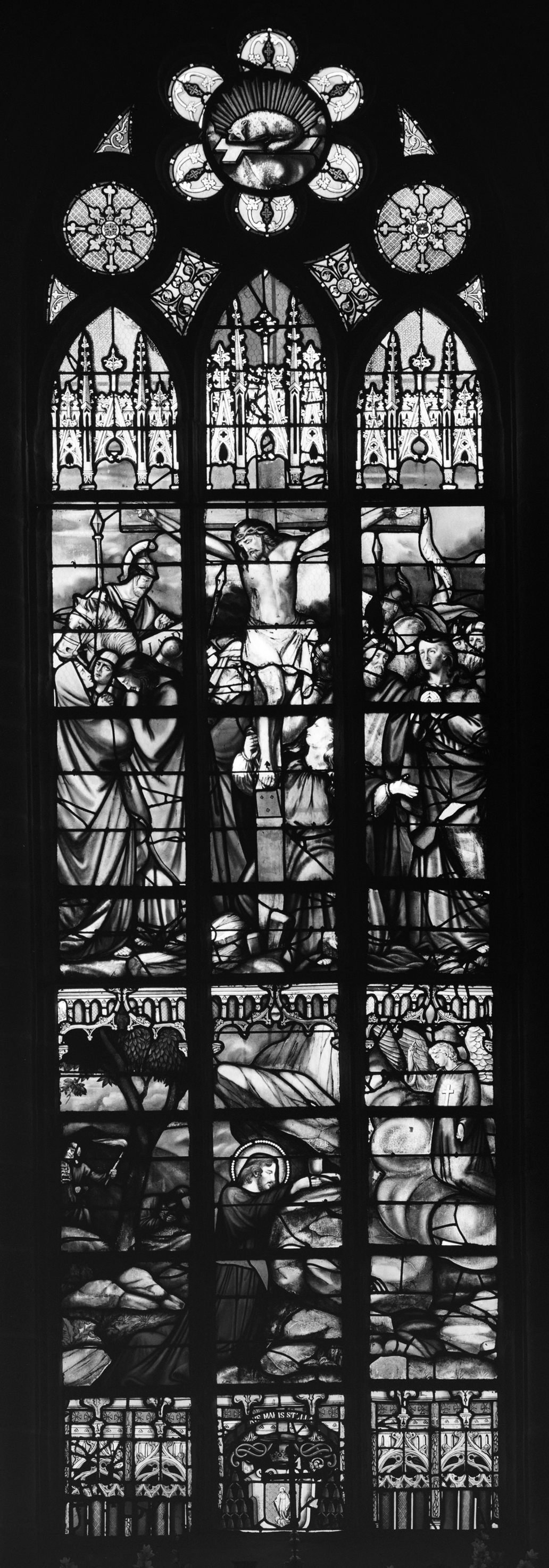 Verrière de la baie 0 : Jardin des Oliviers, Crucifixion (état en 1987)Immatriculation