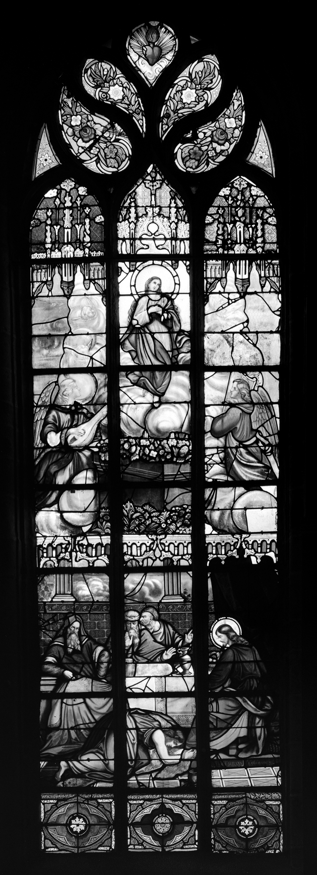 Ensemble des trois verrières à personnages des baies 0, 1 et 2 : Vie du Christ et Vie de la Vierge, église Saint-Hervé (Lanhouarneau),