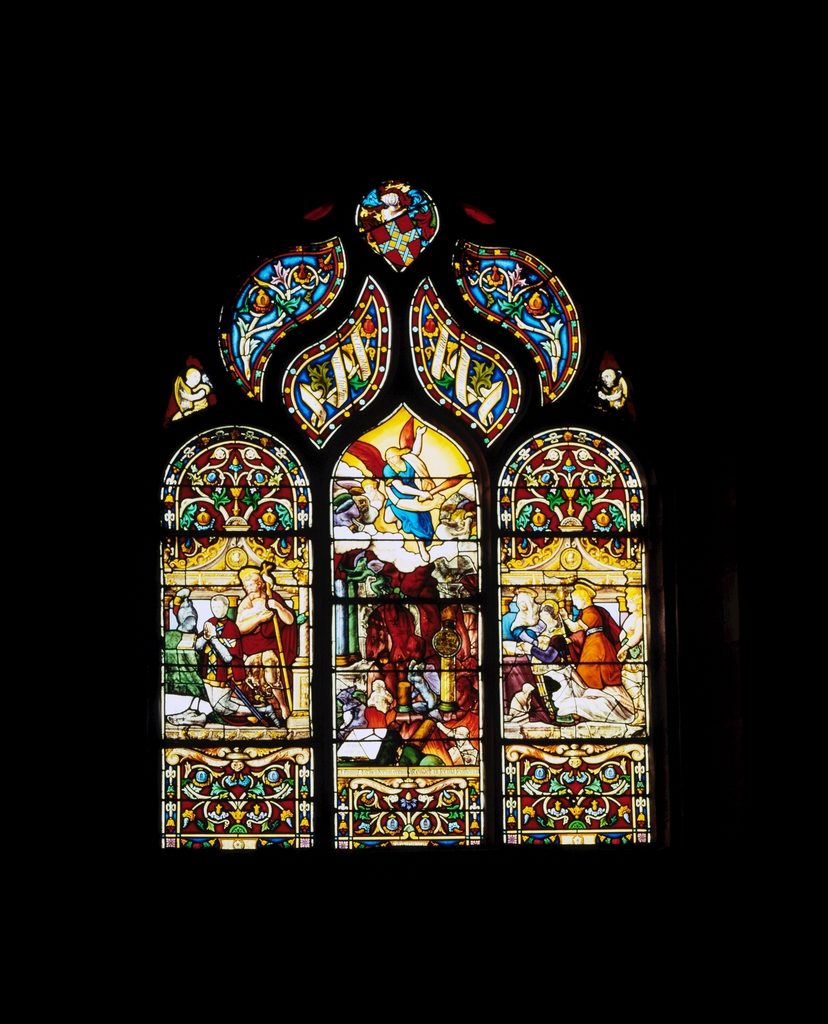 Verrière : Jugement dernier (le), saint Jean-Baptiste et Jean Le Scaff en donateur, sainte anne et saint Jean et Anne du Bois en donatrice (baie 16), cathédrale de Saint-Paul-Aurélien (Saint-Pol-de-Léon),