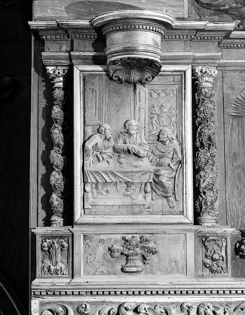 Détail bas-relief, disciples d'EmmaüsImmatriculation