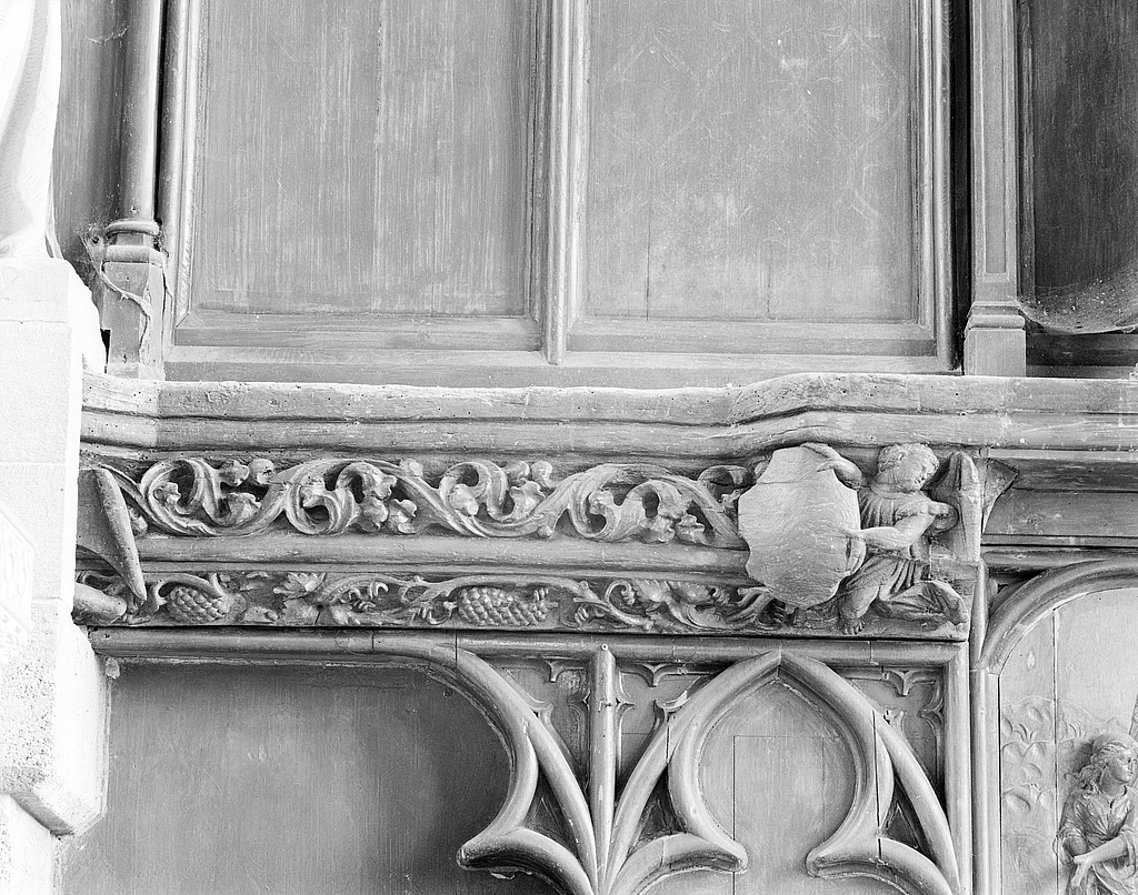 Détail de la partie droite : frise et ange portant un écu.Immatriculation