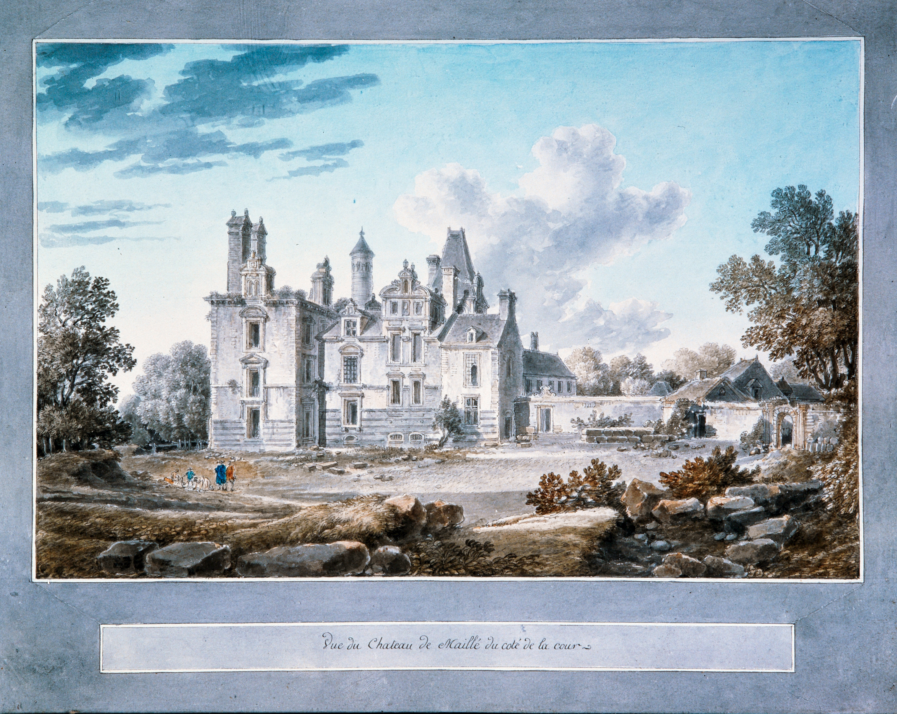 Vue du château de Maillé du côté de la cour. [s. n., s. d., fin 18e siècle]. Dessin sur papier, plume, aquarelle.