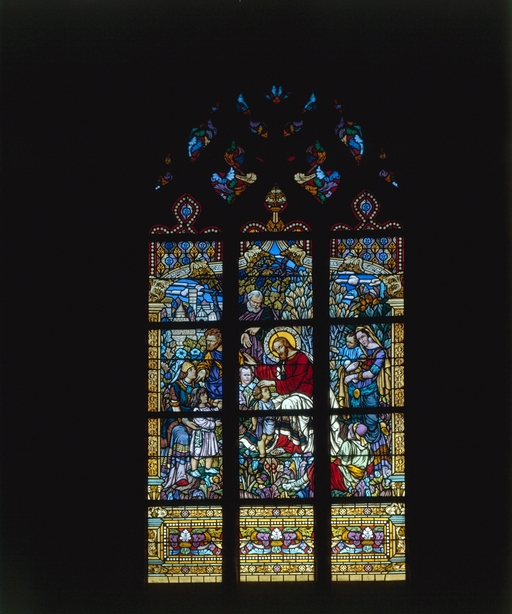 Verrières (3) (verrière figurée) : Résurrection, Saint Louis rend la justice sous un chêne, Jésus bénit les enfants (baies 6, 8, 9), église paroissiale Saint-Martin (Balazé),