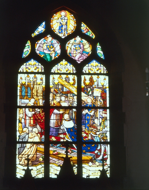 Verrières (9), ex-voto, verrière (verrière à personnages, verrière hagiographique, verrière historiée) : Sainte Famille, Couronnement de Charles VII, Apparition du Sacré Coeur à Marguerite Marie Alacoque, Apparition de la Vierge à Bernadette Soubirous, Délivrance de Saint Pierre par un ange, Saint François de sales enseignant, Education de Saint Louis, Sainte Elisabeth de Hongrie distribuant du pain aux mendiants, Vierge à l'Enfant apparaissant aux poilus dans les tranchées (baies n°4,5,7,9,11,13,15,18,100), église paroissiale Saint-Georges (Châtillon-en-Vendelais),