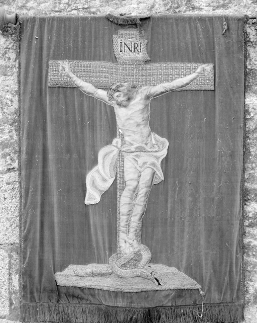 Bannière de procession : Saint Martin, Christ en croix, église paroissiale Saint-Ouen (La Chapelle-Erbrée),