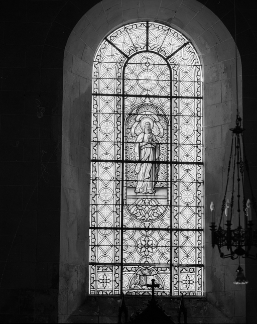 Verrières (2) (verrière à personnages) : Sacré Coeur, Immaculée Conception (baies 3, 4), église paroissiale Saint-Ouen (La Chapelle-Erbrée),