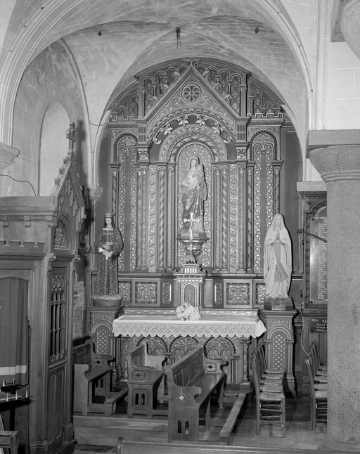Autels (2), tabernacles (2), retables (2) gradins d'autel (2) (autel secondaire, tabernacle à ailes, retable architecturé), style néo-roman, du Sacré Coeur, de la Vierge, église paroissiale Saint-Eloi (Saint-M'Hervé),