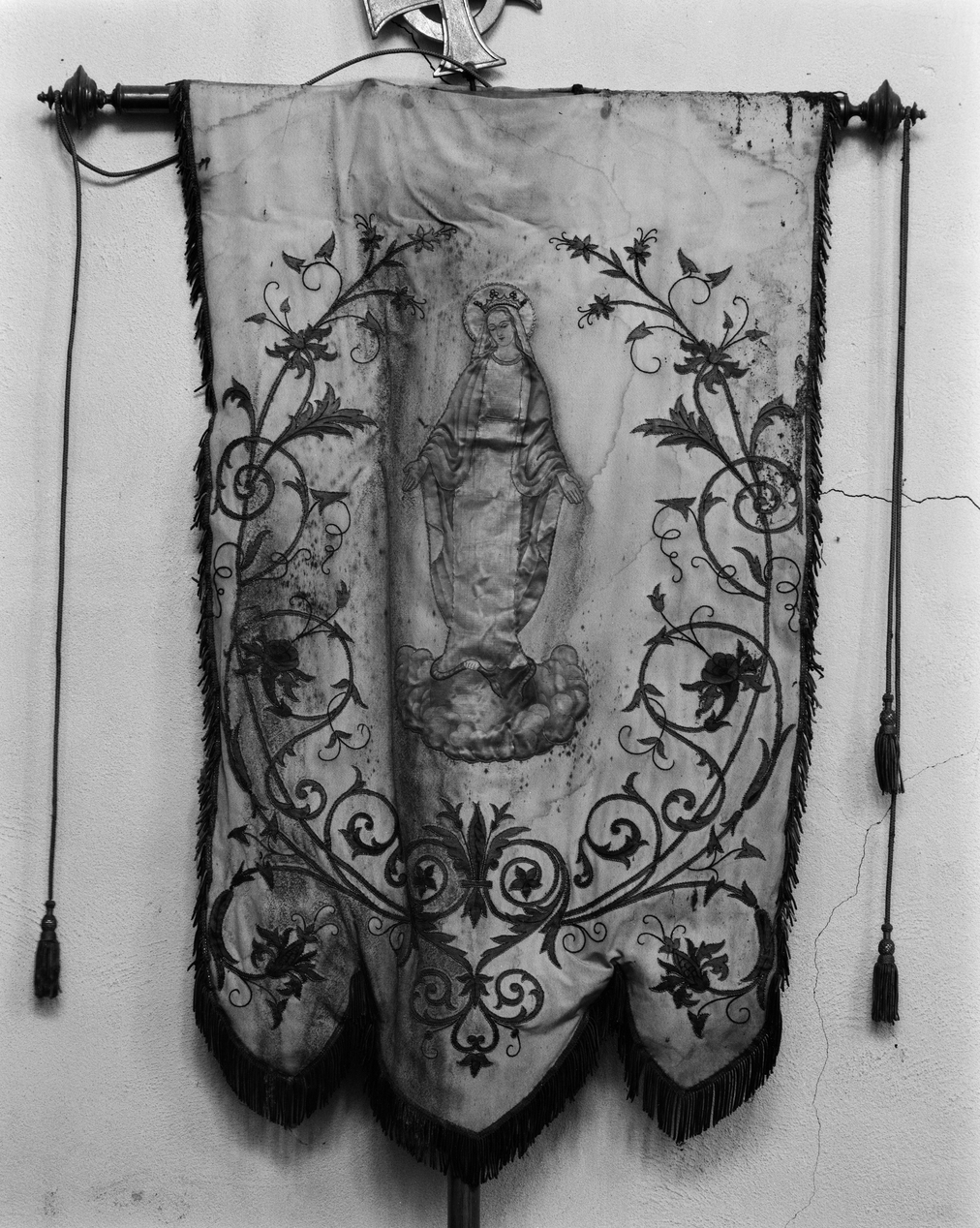 LA TRINITÉ SURZUR, église paroissiale Saint-Servais, bannière de procession Immaculée Conception, vue générale de face.Immatriculation