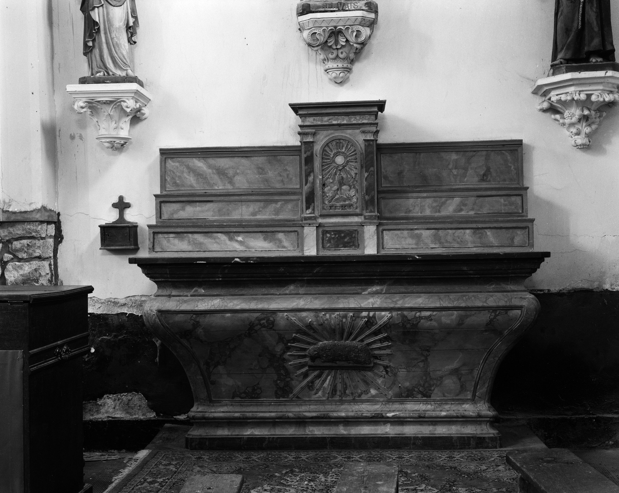 Autel, tabernacle, gradins d'autel (2), prédelle (autel secondaire, autel tombeau) (n° 2), autel Notre-Dame, église paroissiale Saint-Servais (La Trinité-Surzur),