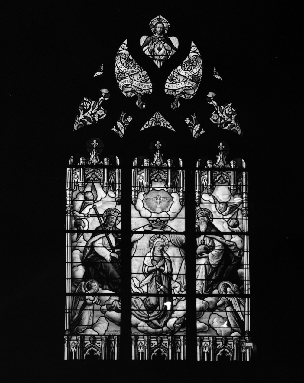 Verrière (3, verrière hagiographique) : couronnement de la vierge, mariage de la vierge, nativité de la vierge (baies 0,1,2), église paroissiale Saint-Symphorien (Surzur),