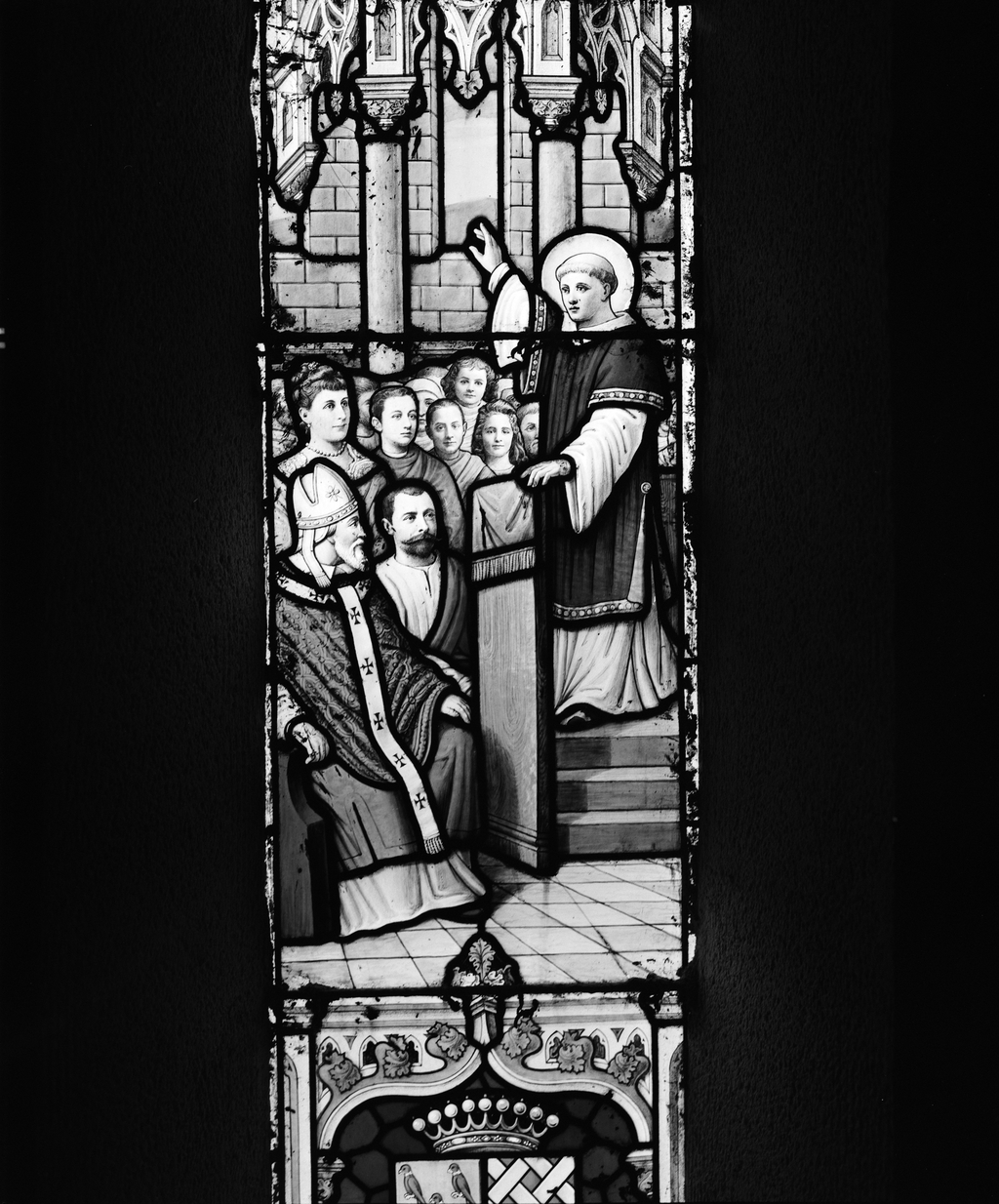 Verrière (8, verrière à personnage, verrière hagiographique) : vie de saint Vincent de Saragosse, saint Paterne de Vannes, saint Symphorien, saint Gildas, saint Goustan (baies 0,2,3,4,5,6,7,9), église paroissiale Saint-Vincent (Le Hézo),