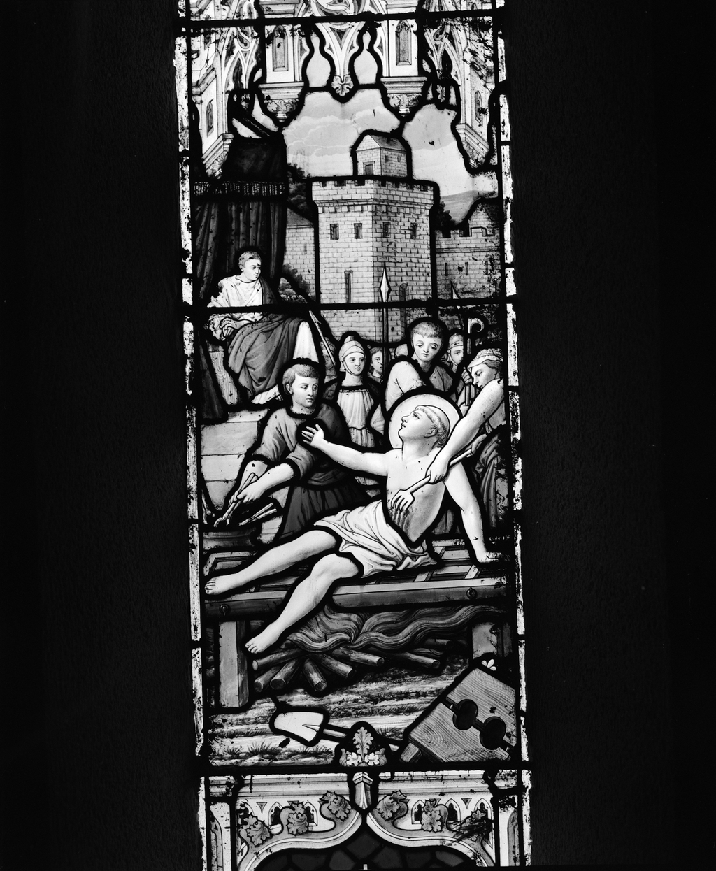 Verrière (8, verrière à personnage, verrière hagiographique) : vie de saint Vincent de Saragosse, saint Paterne de Vannes, saint Symphorien, saint Gildas, saint Goustan (baies 0,2,3,4,5,6,7,9), église paroissiale Saint-Vincent (Le Hézo),