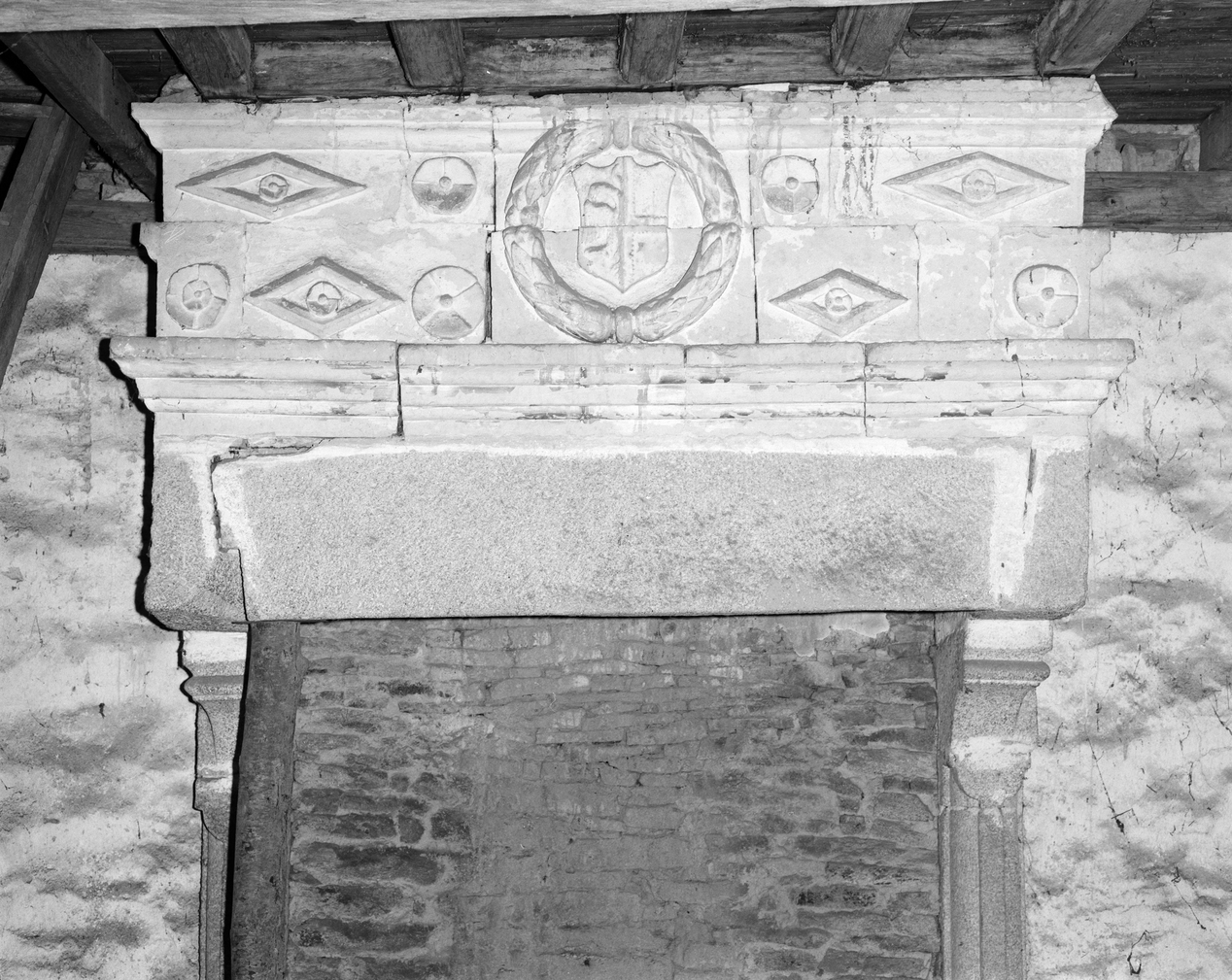SAINT-AVÉ, Botloré, manoir, cheminée de l'étage, détail linteau.Immatriculation