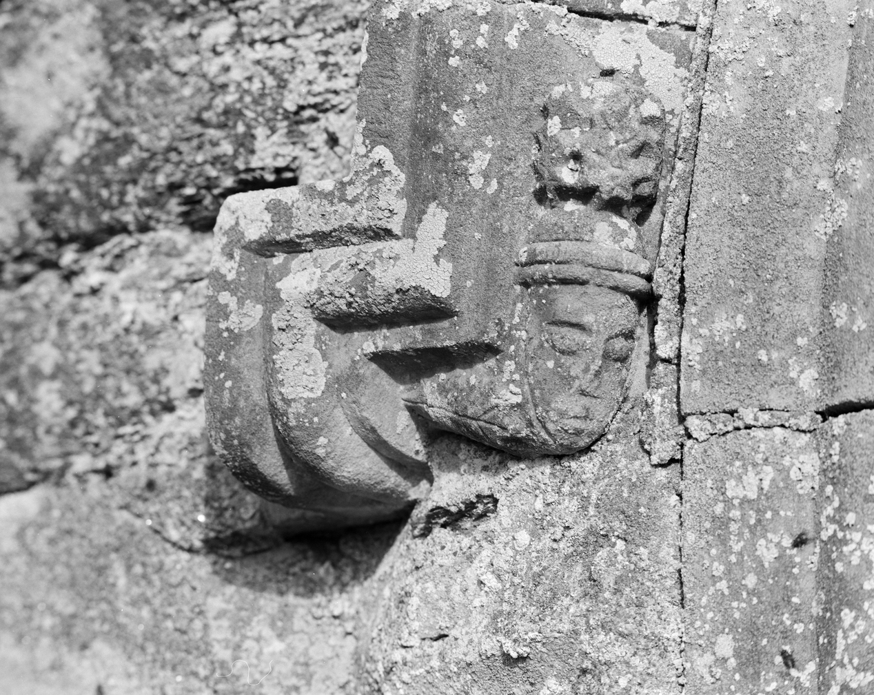 Manoir, logis, tour sud-ouest, crossette gauche de la porte : portrait d'homme portant un chaperon à bourrelet surmonté de houx (état en 1988)Immatriculation