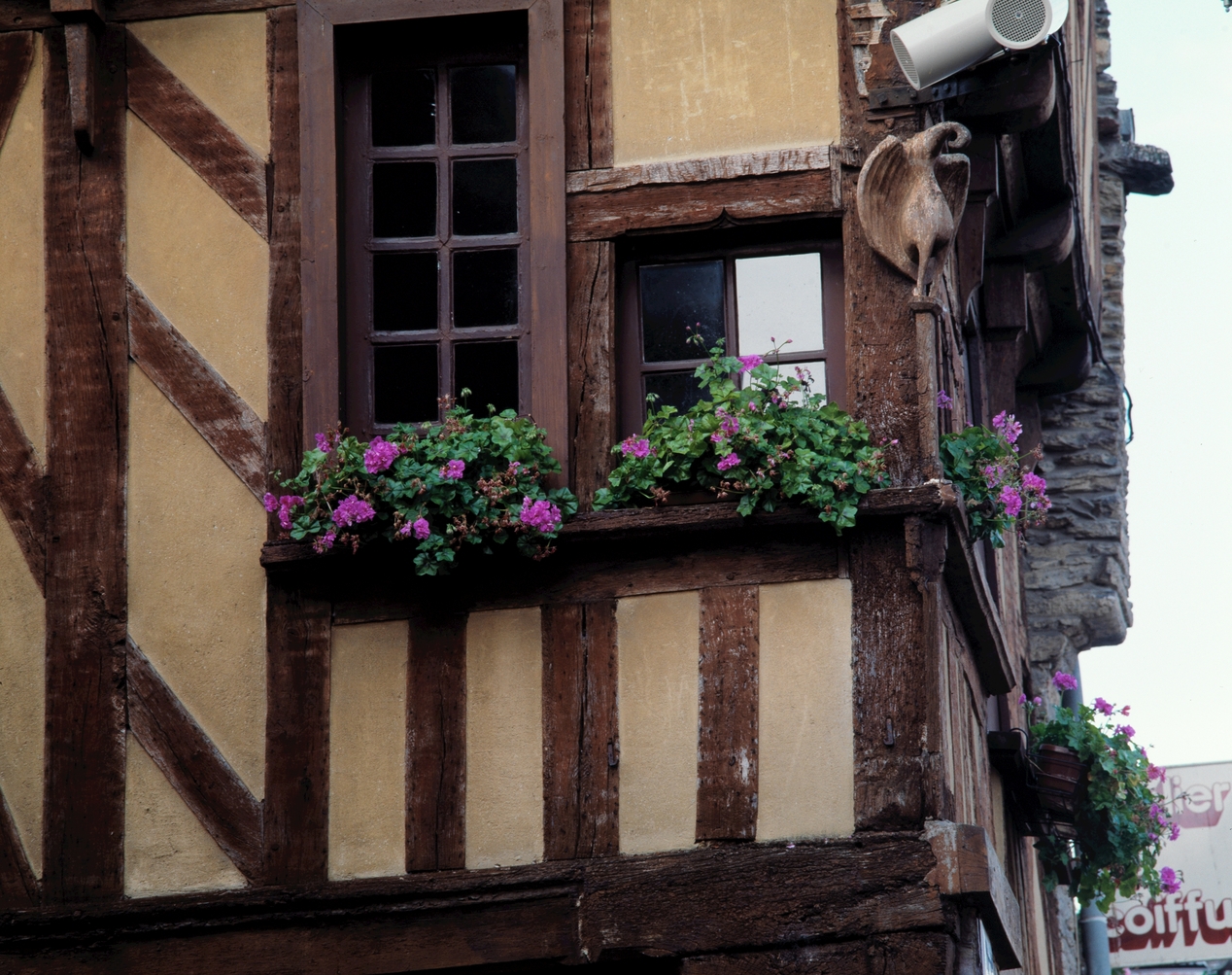 Maison : élévation sur la rue Sainte-Anne, 2e niveau : les fenêtres d'angle et le pélican (état en 1988)Immatriculation