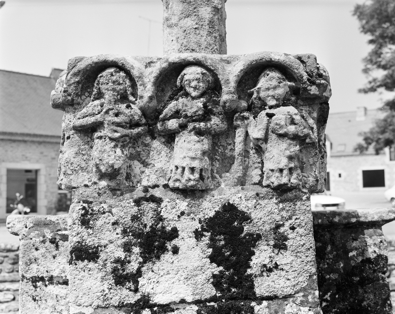 Enclos de la chapelle Notre-Dame-du-Loc, calvaire, socle, face est : saint Jean-baptiste, saint Laurent, saint Jacques.Immatriculation