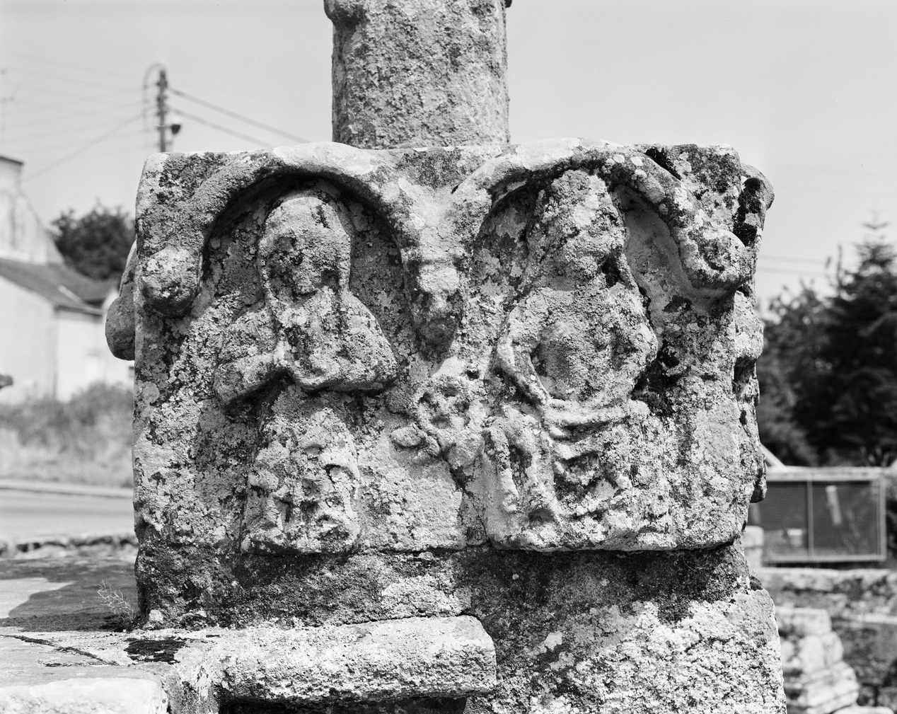 Enclos de la chapelle Notre-Dame-du-Loc, calvaire, socle, face sud : sainte Madeleine, Vierge de Pitié ?Immatriculation