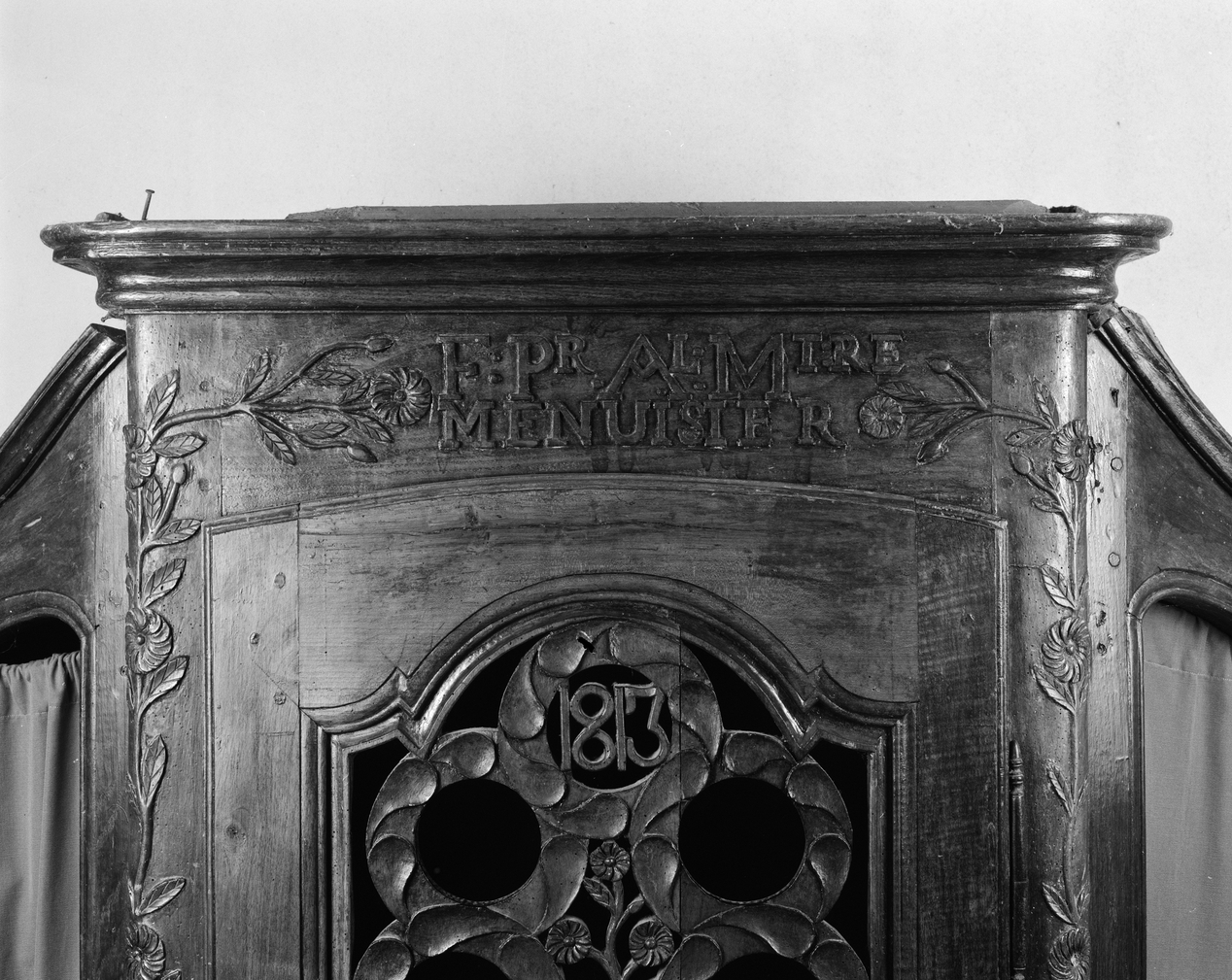 Confessionnal, partie supérieure de la travée centrale : décor, inscription et date (état en 1988)Immatriculation