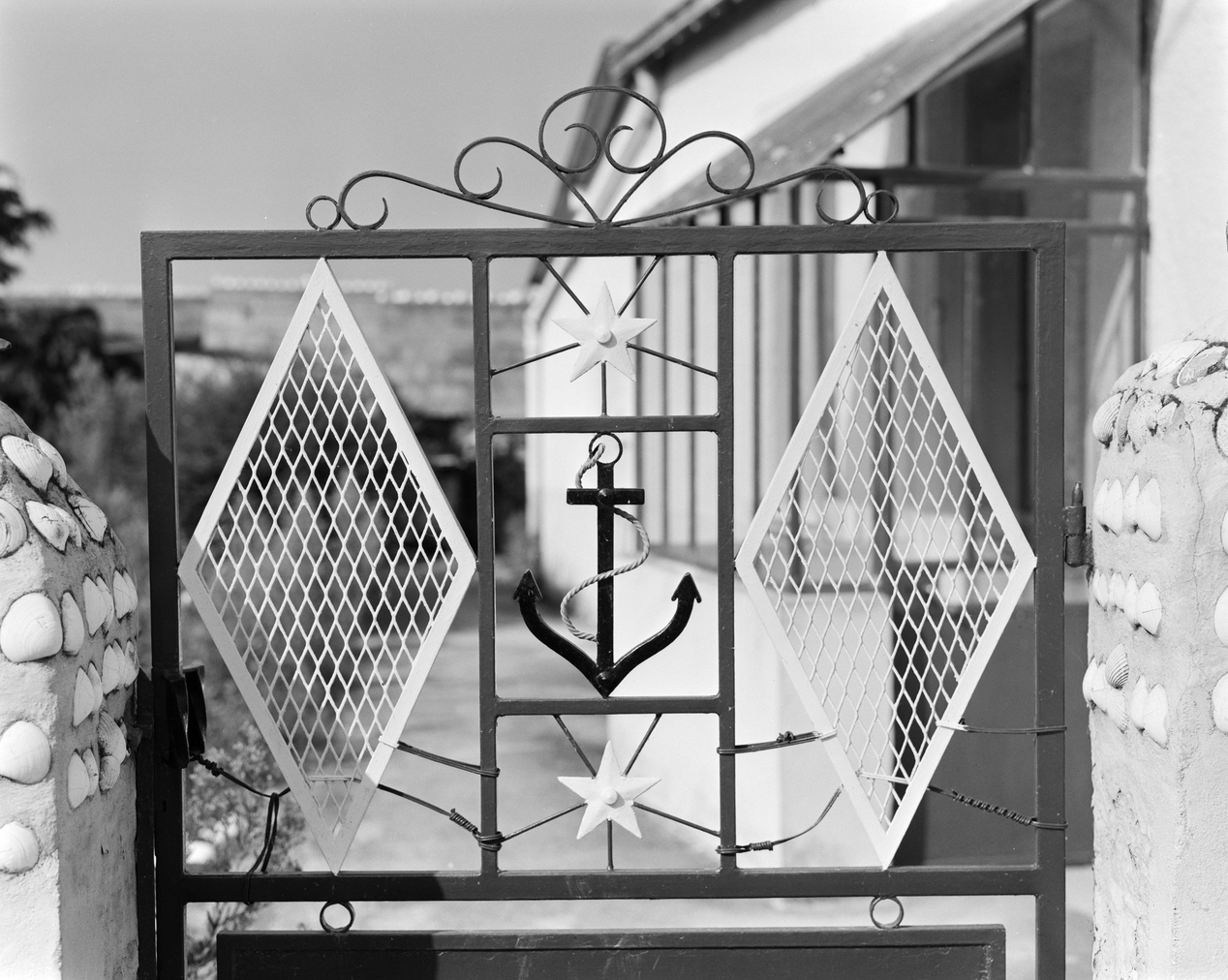 Michotte, maison de pêcheur aux coquillages, détail portail avec grille et ancre.Immatriculation