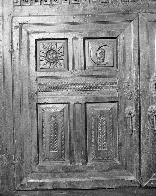 Armoire, détail du battant gauche : motifs du soleil et de la lune (premier étage, pièce sud).Immatriculation
