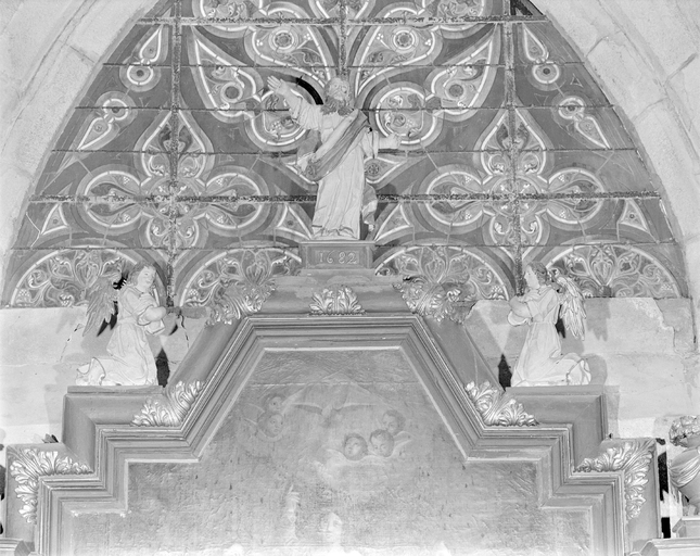 Détail du couronnement du retable : Christ bénissant et dateImmatriculation