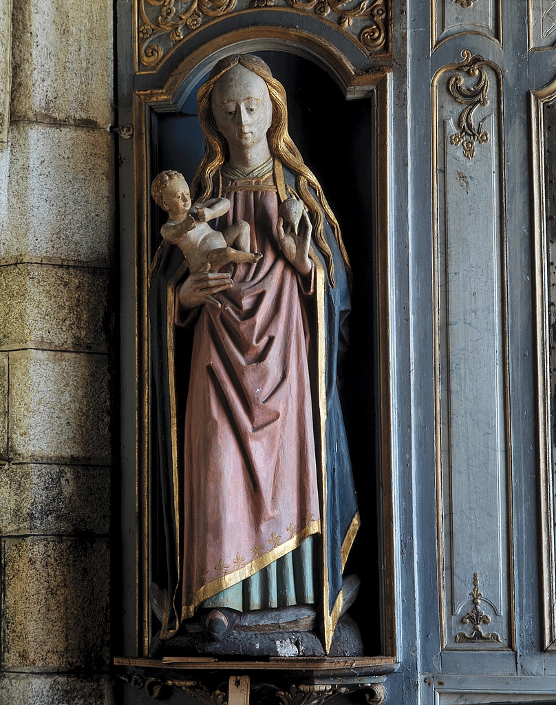 Statue (petite nature, d'applique) : Vierge à l'Enfant (2), dite à la poire, église Saint-Mélar (Meilars),