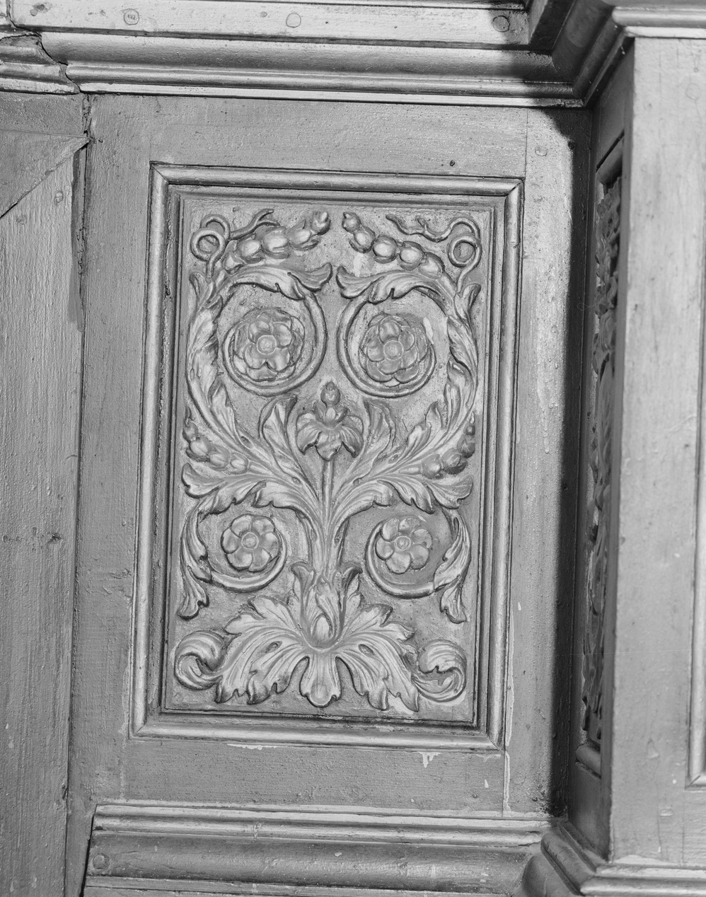 Retable, tabernacle, pilastre de gauche, détail du soubassement.Immatriculation
