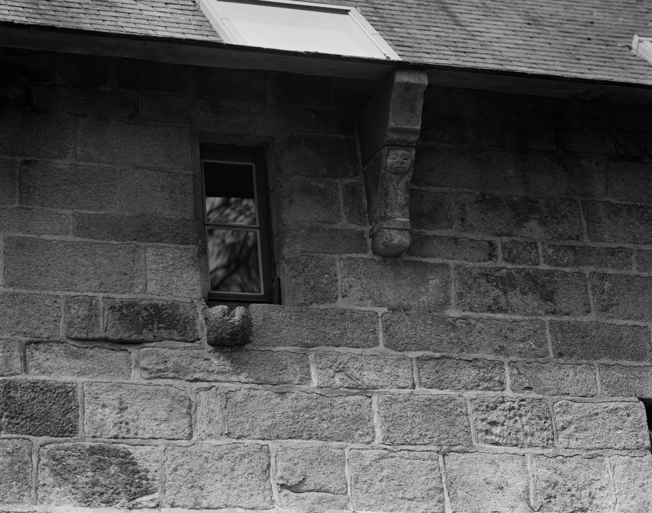 Moulin de Lesnehué, mur nord, corbelet supportant le toit et évacuation d'un évier.Immatriculation