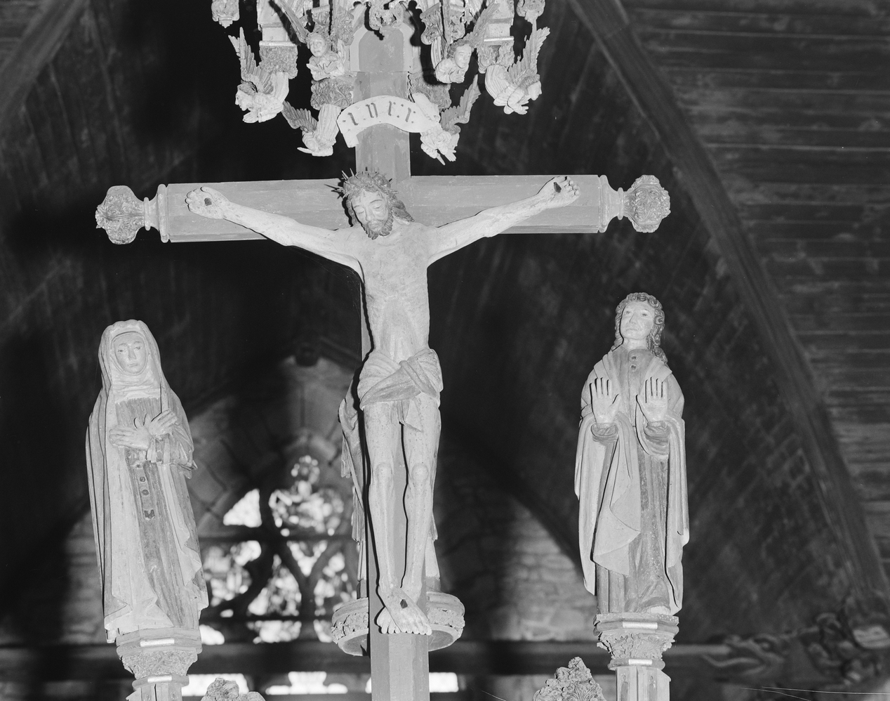Calvaire, détail Christ en croix, Vierge et saint Jean.Immatriculation