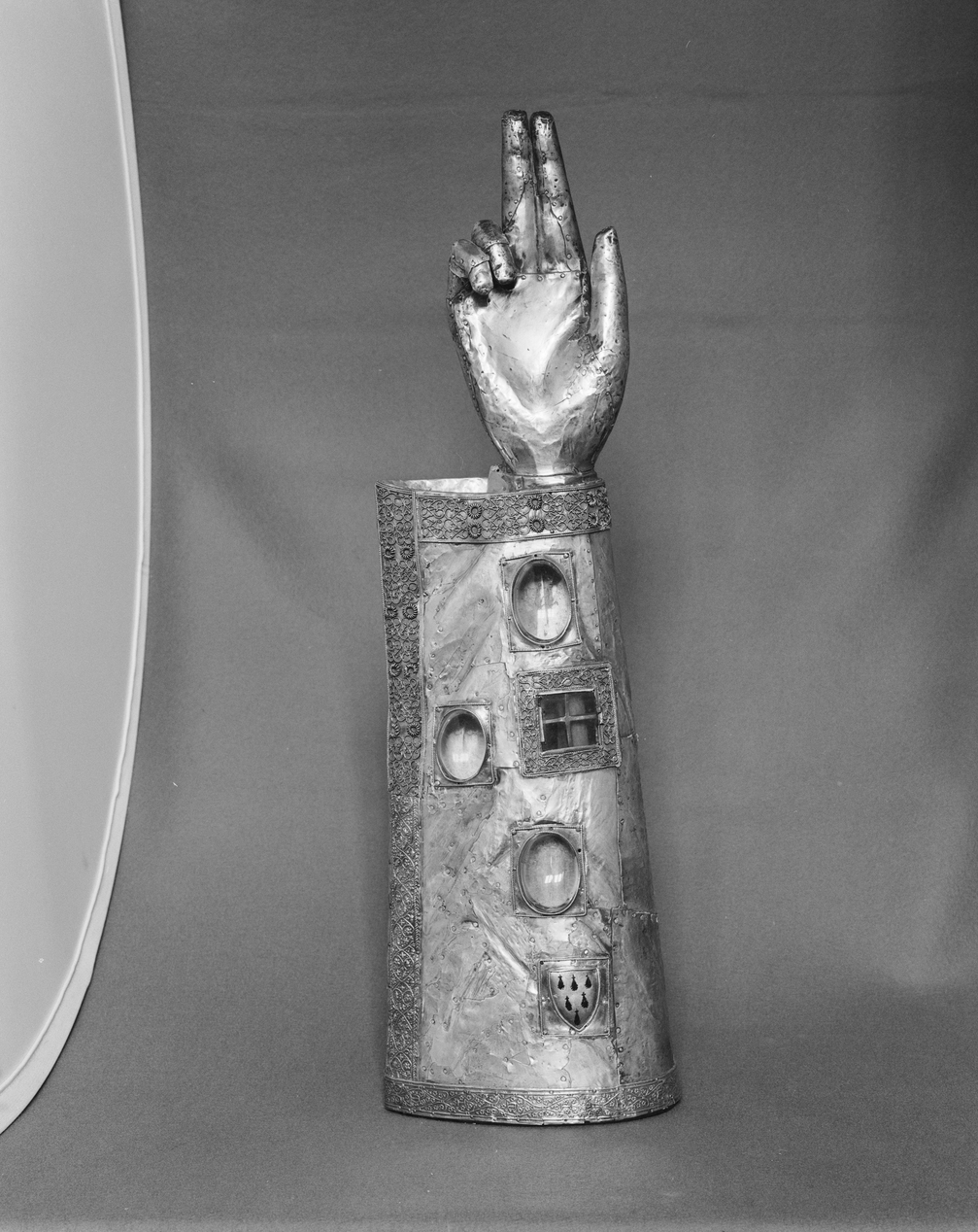 Reliquaire morphologique (bras-reliquaire), de saint Gildas, abbaye de bénédictins Saint-Gildas, de bénédictins de la congrégation de Saint-Maur, de soeurs de la charité de Saint-Louis (Saint-Gildas-de-Rhuys),