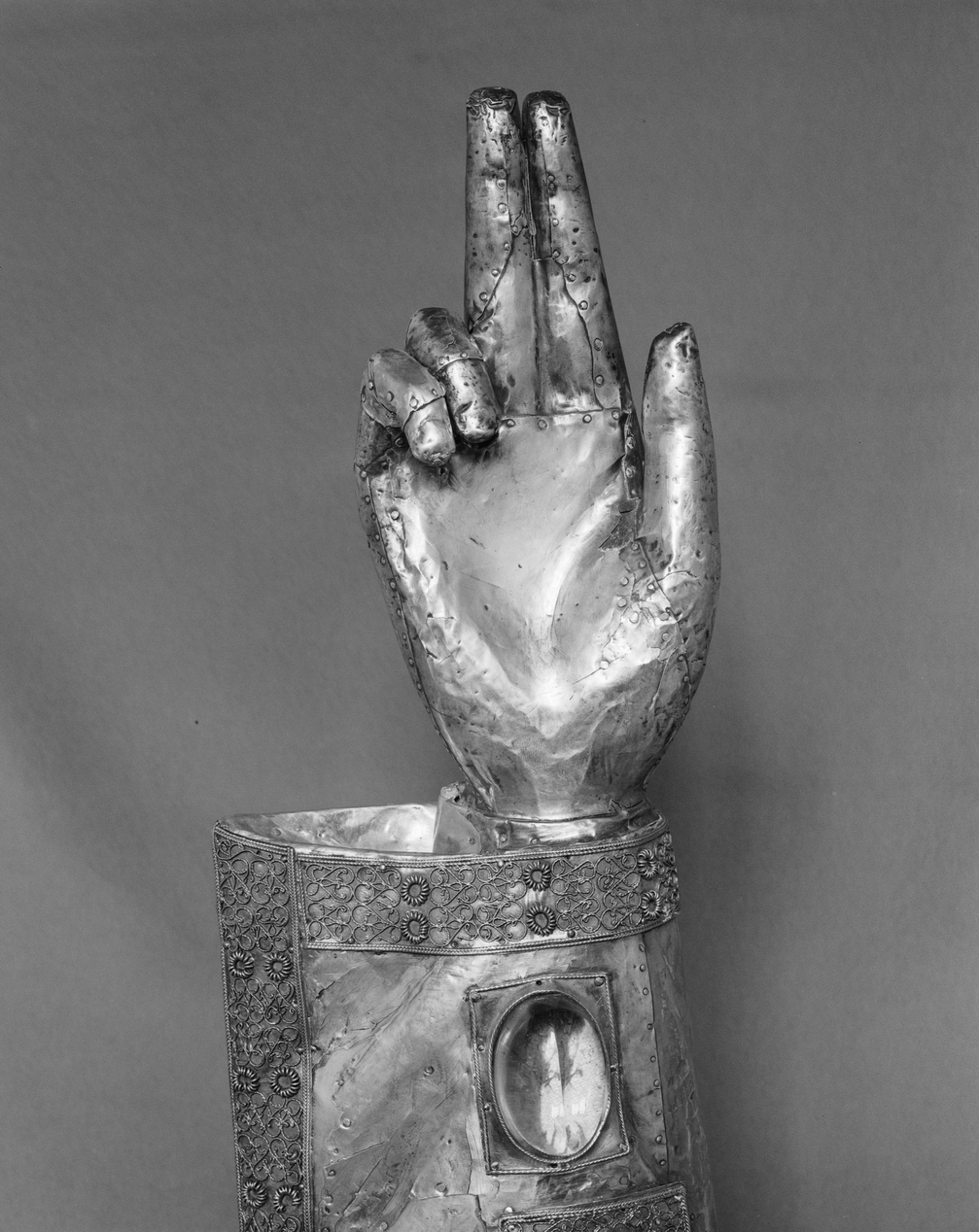 Reliquaire morphologique (bras-reliquaire), de saint Gildas, abbaye de bénédictins Saint-Gildas, de bénédictins de la congrégation de Saint-Maur, de soeurs de la charité de Saint-Louis (Saint-Gildas-de-Rhuys),