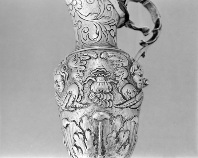 Plateau et burettes - Burette à vin, détail bourse et écus.Immatriculation