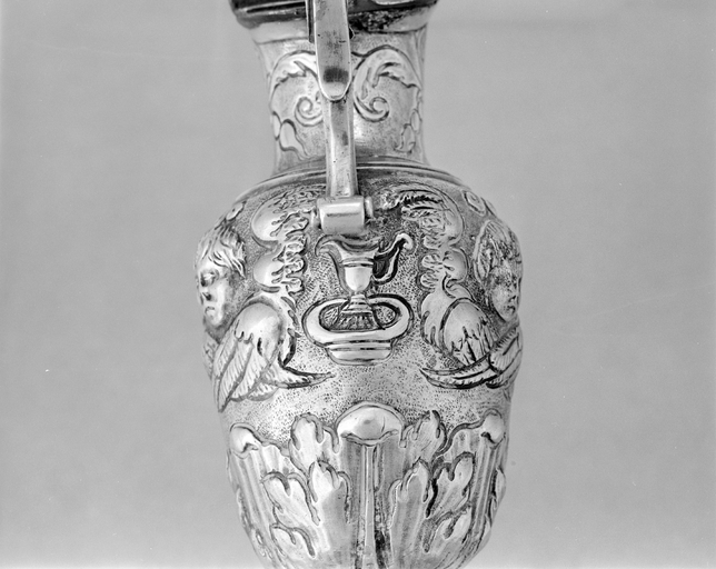 Plateau et burettes - Burette à vin, détail du motif sous l'anse : burette et plateau.Immatriculation