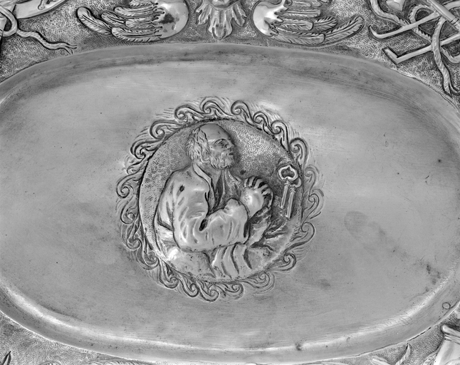 Plateau et burettes - Plateau : détail de saint Pierre.Immatriculation