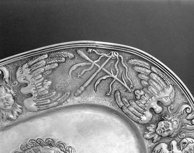 Plateau et burettes - Plateau : détail du décor, emblèmes de la Passion, fouet et éponge.Immatriculation