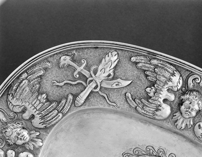 Plateau et burettes - Plateau, détail du décor : insrtument de la Passion, glaive et flambeau.Immatriculation