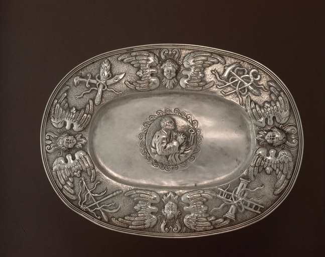 Plateau et burettes - Plateau : vue générale du dessus.Immatriculation