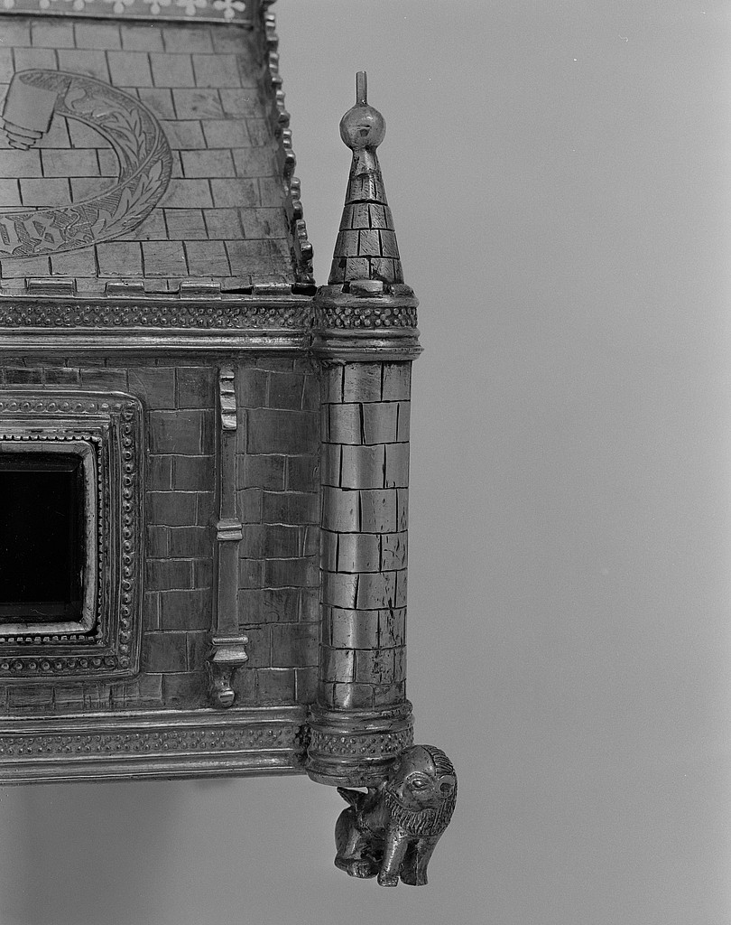 Détail d'une tourelle du reliquaire avec pied en forme de lion.Immatriculation