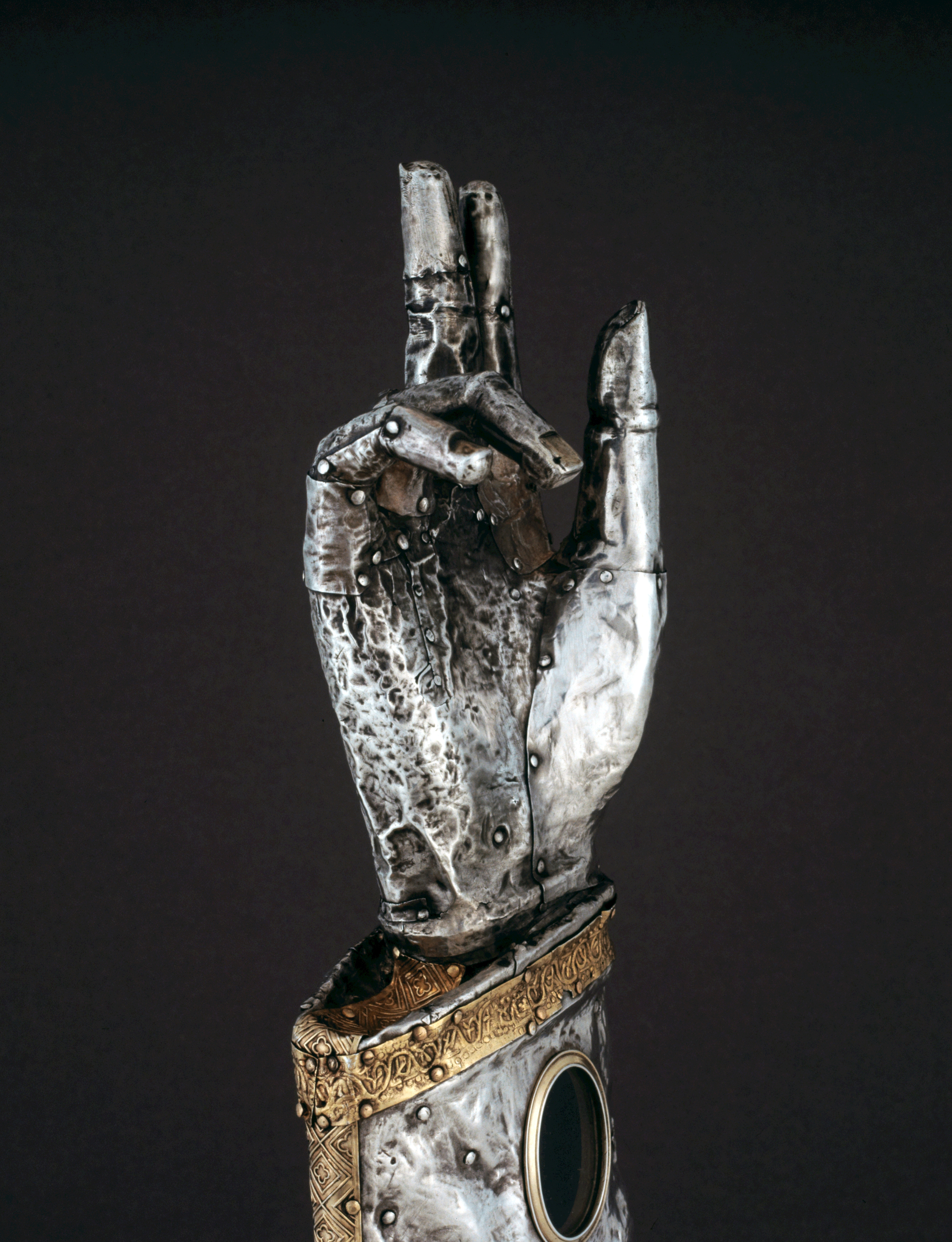 Bras-reliquaire : la main vue de trois-quarts, du côté de la paume (état en 1990)Immatriculation